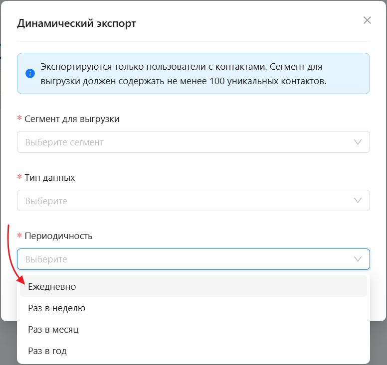 Реализовали возможность ежедневной выгрузки данных на рекламные платформы. Для этого в разделе «Ретаргетинг» при динамическом экспорте в поле «Периодичность» выберите вариант «Ежедневно». Если днём зритель сделает покупку и его данные попадут в CRM, то вечером этого же дня он увидит рекламу кинотеатра в интернете: в соцсетях, на сайтах, сервисах и платформах VK и Яндекса.