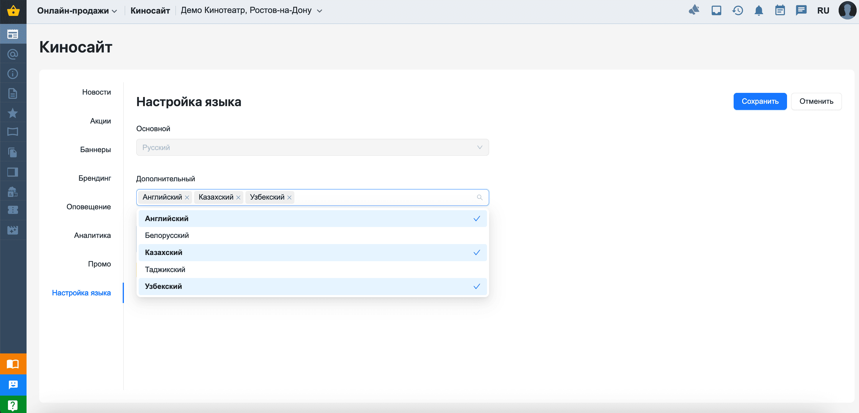 Добавили возможность выбирать дополнительные языки для отображения контента на киносайте. После изменения настроек локализации у вас появится возможность заполнять языковые версии в разделах «Акции», «Баннеры», «Новости» и «О кинотеатре». Теперь посетители вашего кинотеатра смогут выбрать предпочитаемый язык, и контент будет отображаться на этом языке. Подробную информацию о настройках читайте в руководстве пользователя.