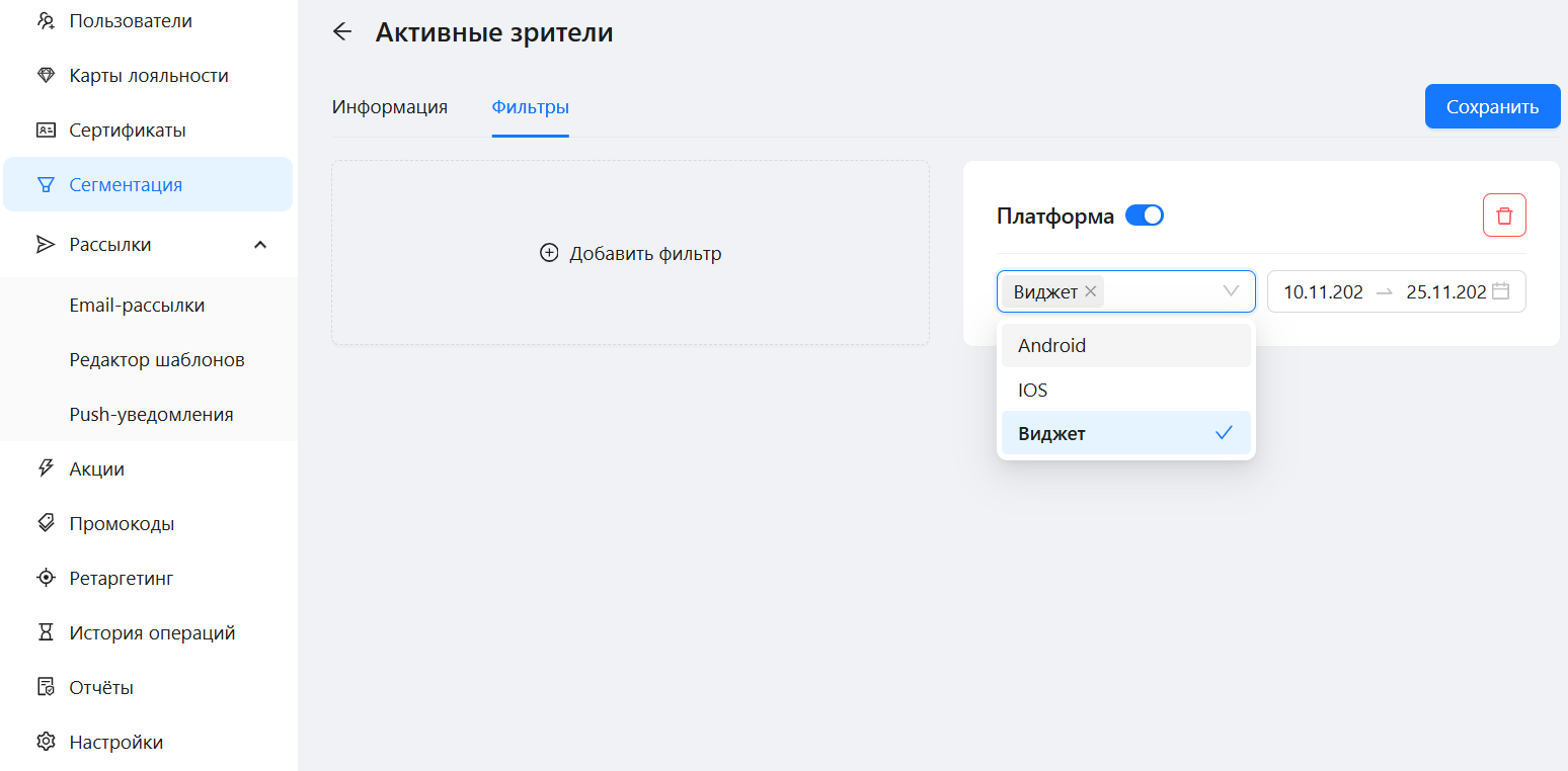 В «Сегментации» появился новый фильтр «Платформа». Он позволяет узнать, что чаще используют лояльные пользователи: виджет или мобильные приложения (iOS, Android). Пользователям мобильных приложений можно отправить пуш-уведомления, остальным пользователям сделать рассылку по почте или настроить для них таргетированную рекламу. Обратите внимание, что данные начали собираться с момента запуска фильтра — с 6 ноября.