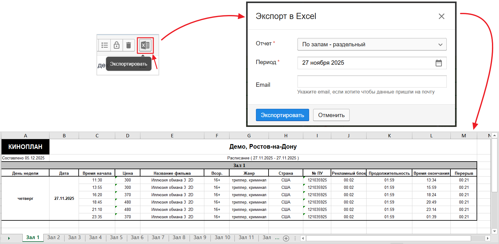 На базе отчёта «По залам, расширенная версия» создали новый отчёт по расписанию: «По залам – раздельный». Добавили в него столбцы с жанром, страной, длительностью рекламных роликов из Планирования рекламы. Также сеансы по разным залам разнесены в этом отчёте по разным листам.