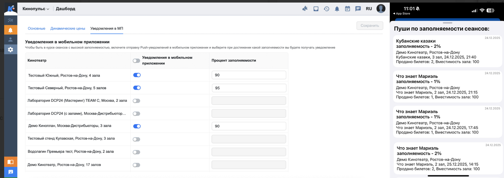 В мобильном приложении Кинопульс можно получать Push-уведомления о сеансах с высокой заполняемостью. В настройках Кинопульса укажите уровень заполняемости, при котором хотите получать уведомления. Новая версия приложения доступна для iOS и Android в RuStore и Google Play. Подробнее в статье.