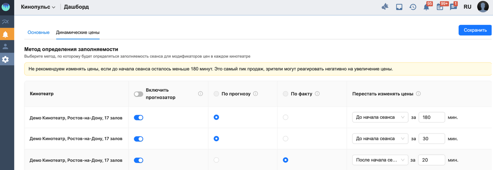 В настройках динамического ценообразования теперь можно указать, за сколько времени до или после начала сеанса остановить изменение цен. С его наступлением прекращается передача данных о заполняемости в БС Премьера, и цены на билеты перестают меняться. По умолчанию установлен запрет на отправку за 180 минут до начала сеанса. Не рекомендуем изменять цены на сеансы в самый пик продаж, когда до начала осталось менее 120 минут. Подробнее в статье.