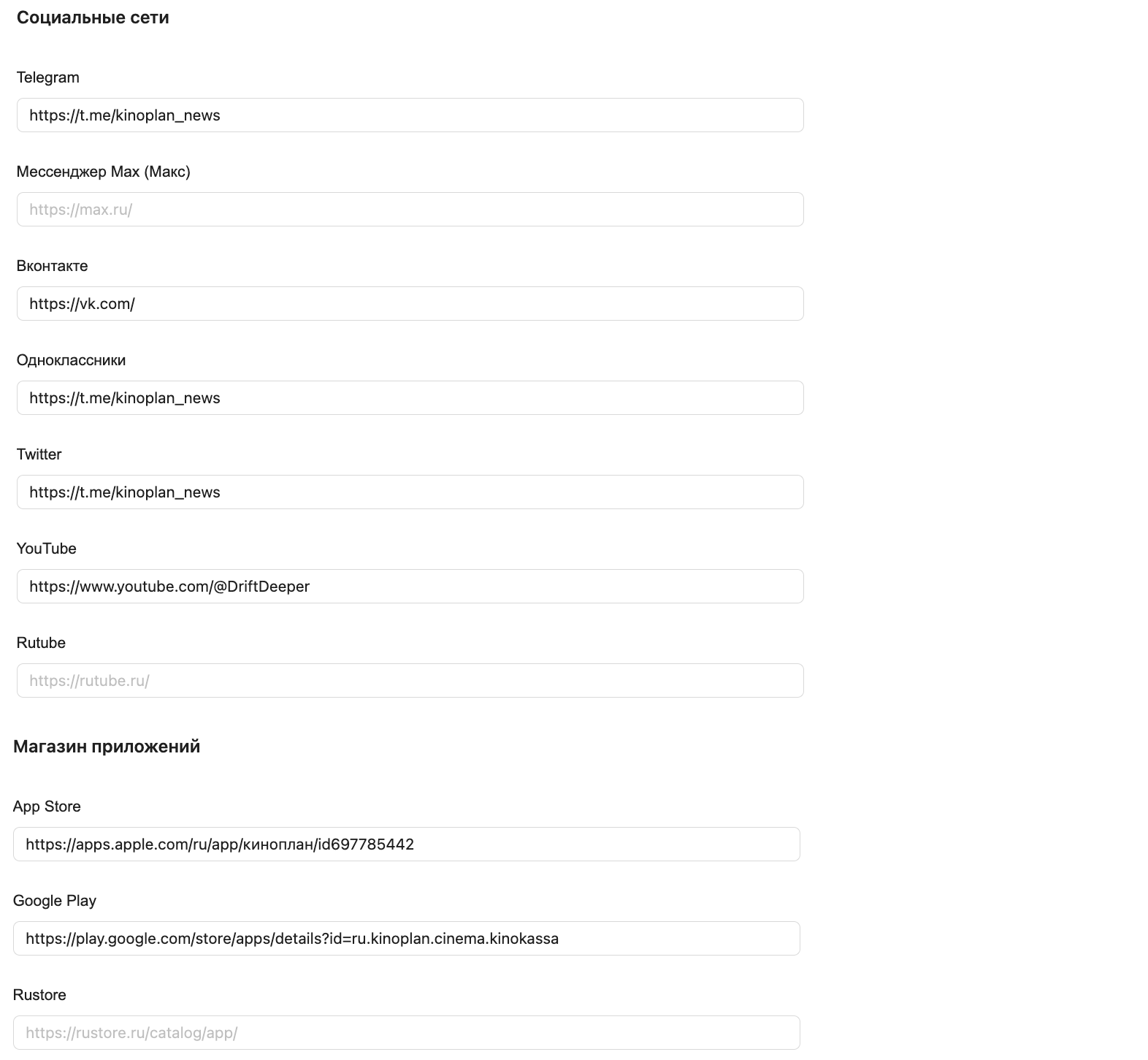 В разделе «Информация о кинотеатре» в Онлайн-продажах появились новые поля для добавления ссылок на мессенджер Max, Rutube и RuStore. После добавления ссылок их логотипы будут отображаться на киносайте.